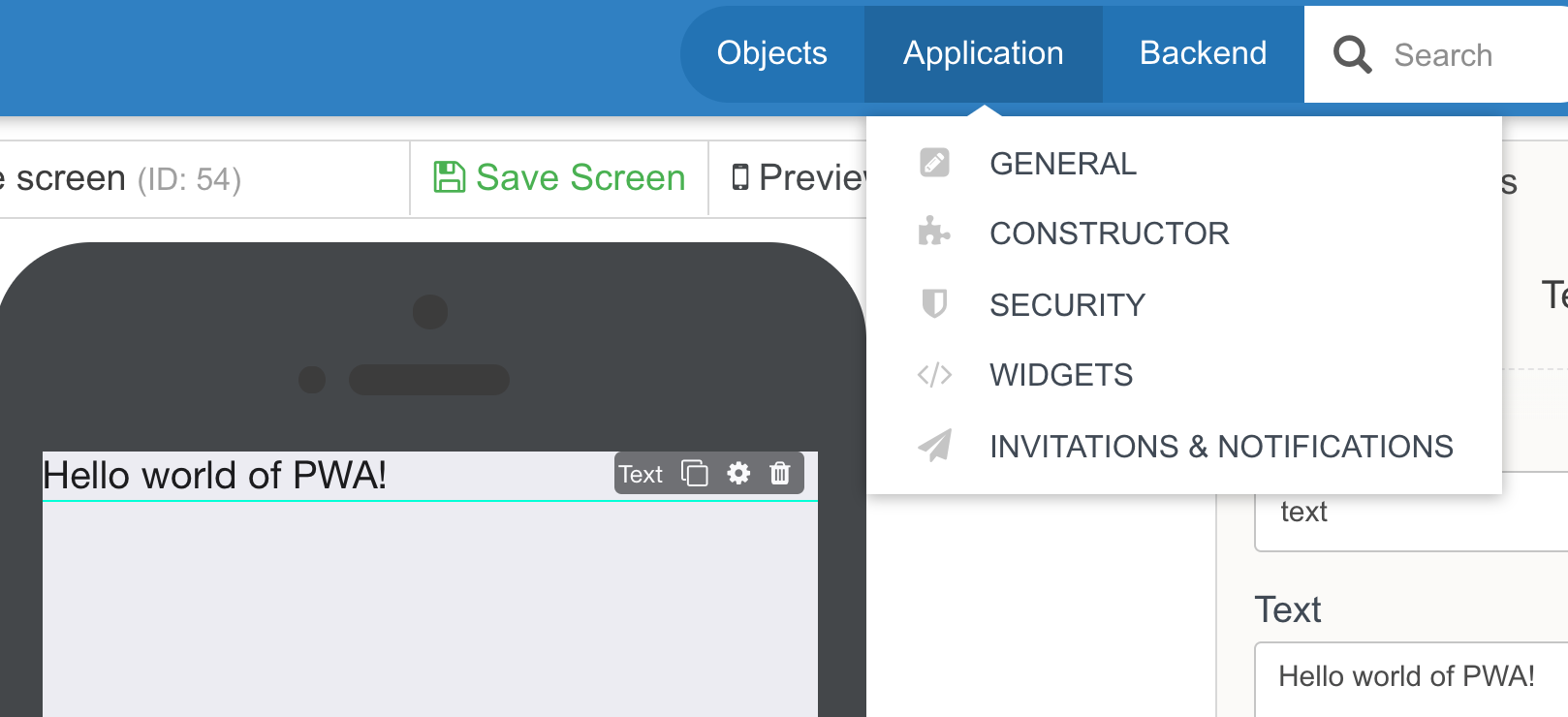 Go to the properties of Text element and change its text to "Hello world of PWA!"