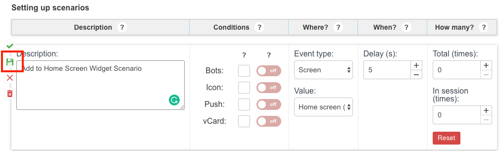 Save the scenario by clicking the "Diskette" button framed red on the screenshot below