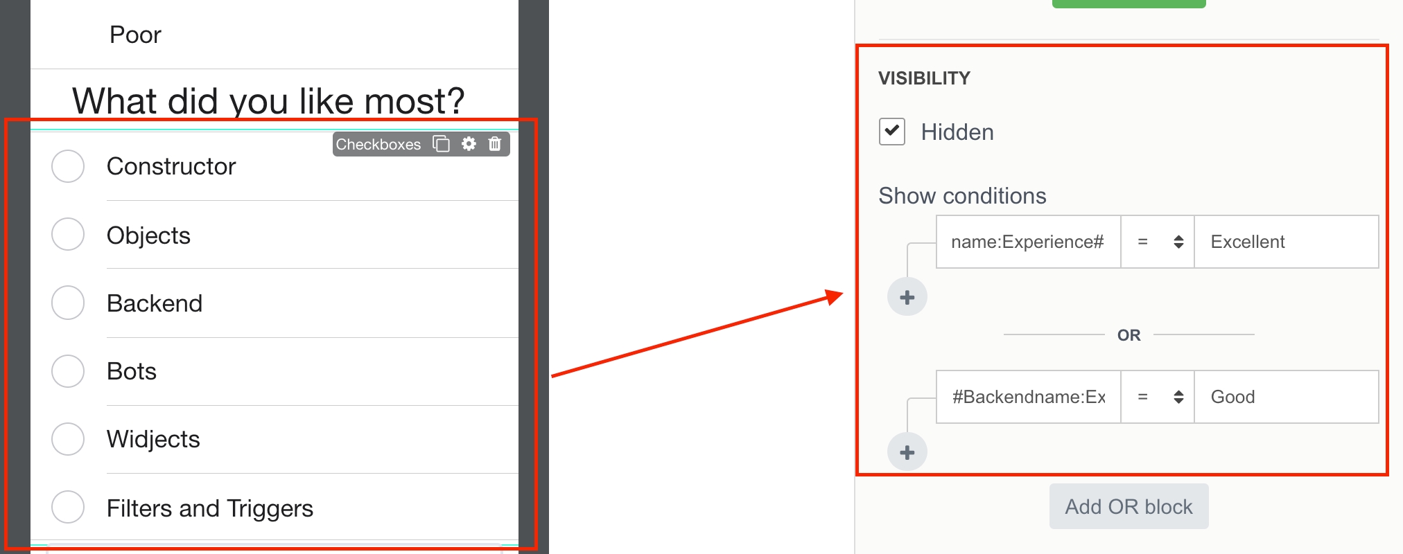 2. Set reference to the above Radio Button's value in Show conditions
