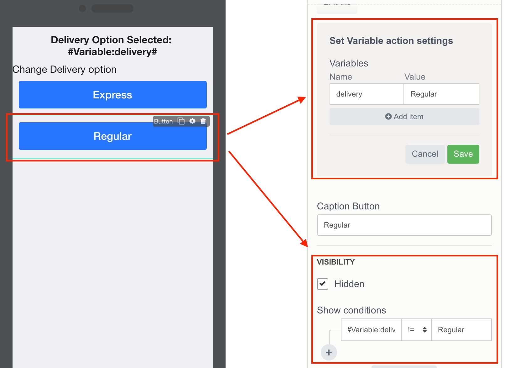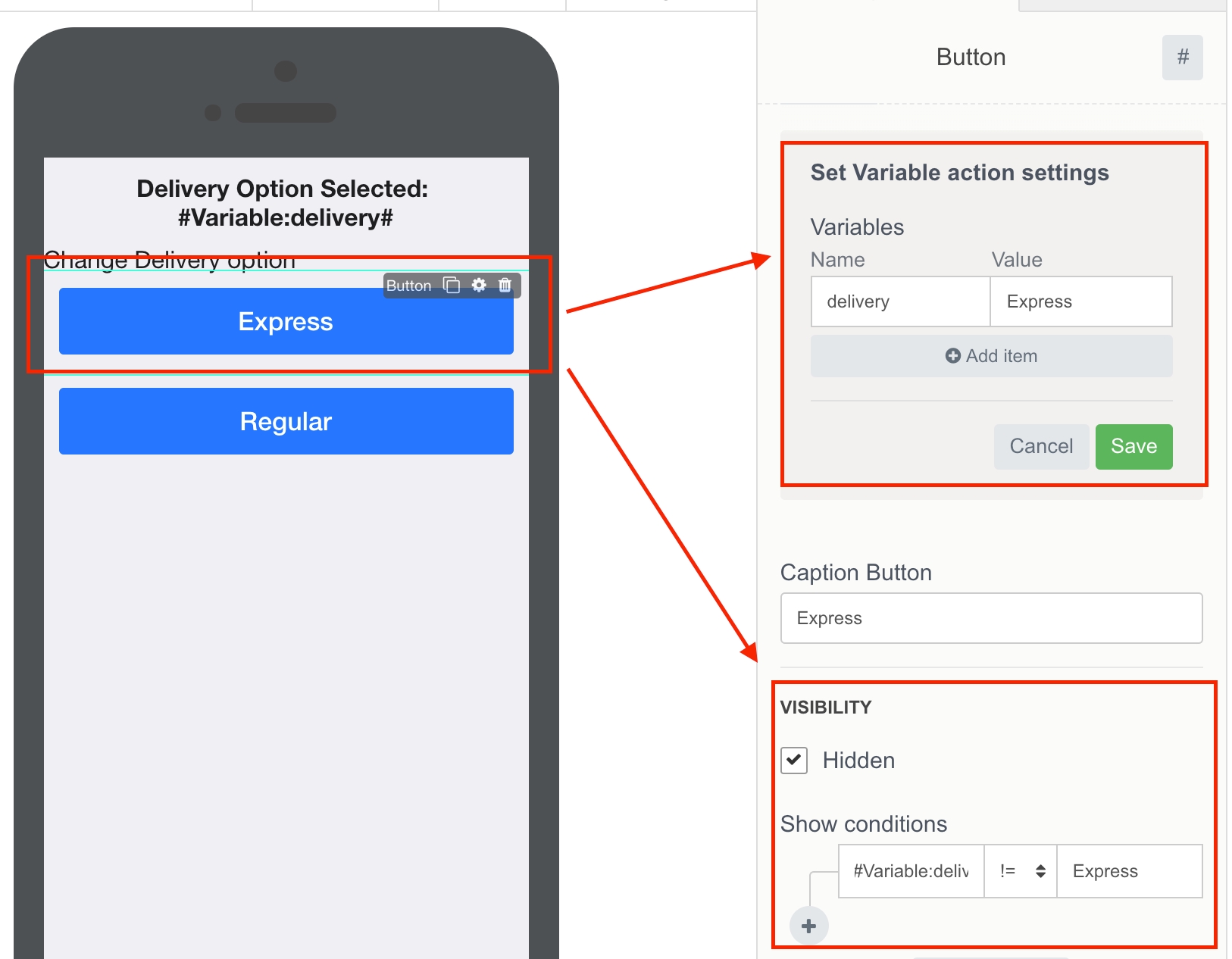 In another example - Pizza delivery app has two options for delivery: Express and Regular. Using Variables, we show / hide the buttons with delivery options.