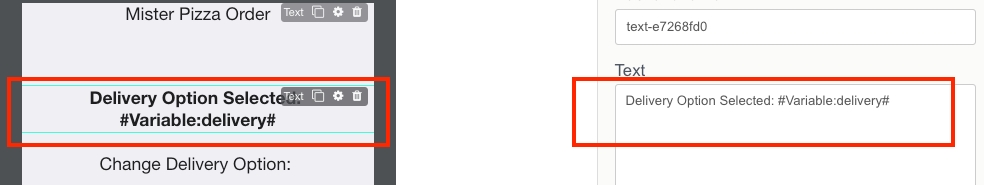 1. Drag and drop Text element, fill in Text field with Delivery Option Selected: #Variable:delivery#.