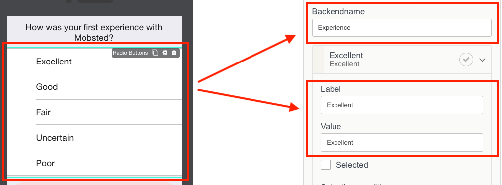 Add new lines of choices for Radio Button and fill in labels (what's shown) and values (if selected):