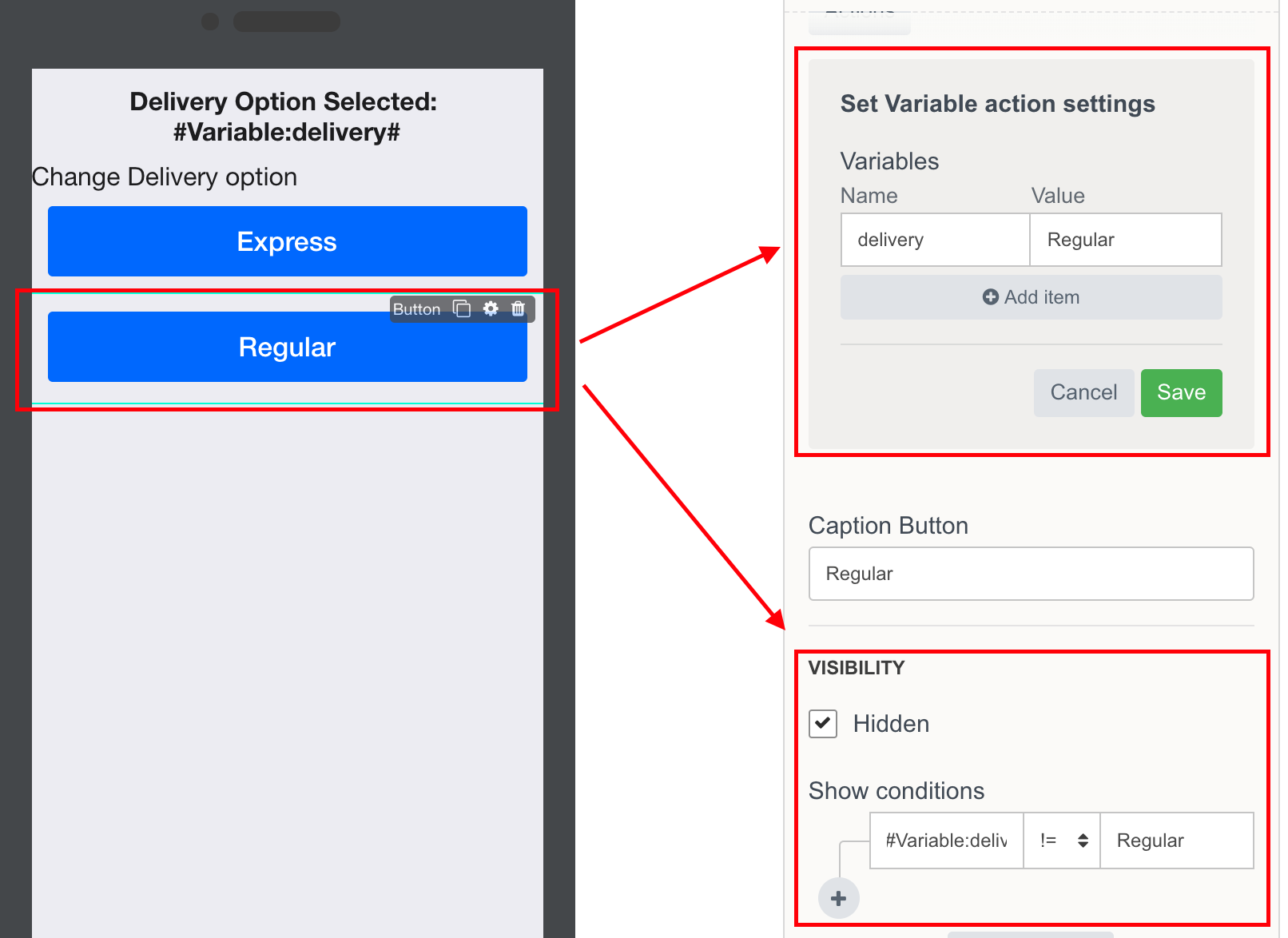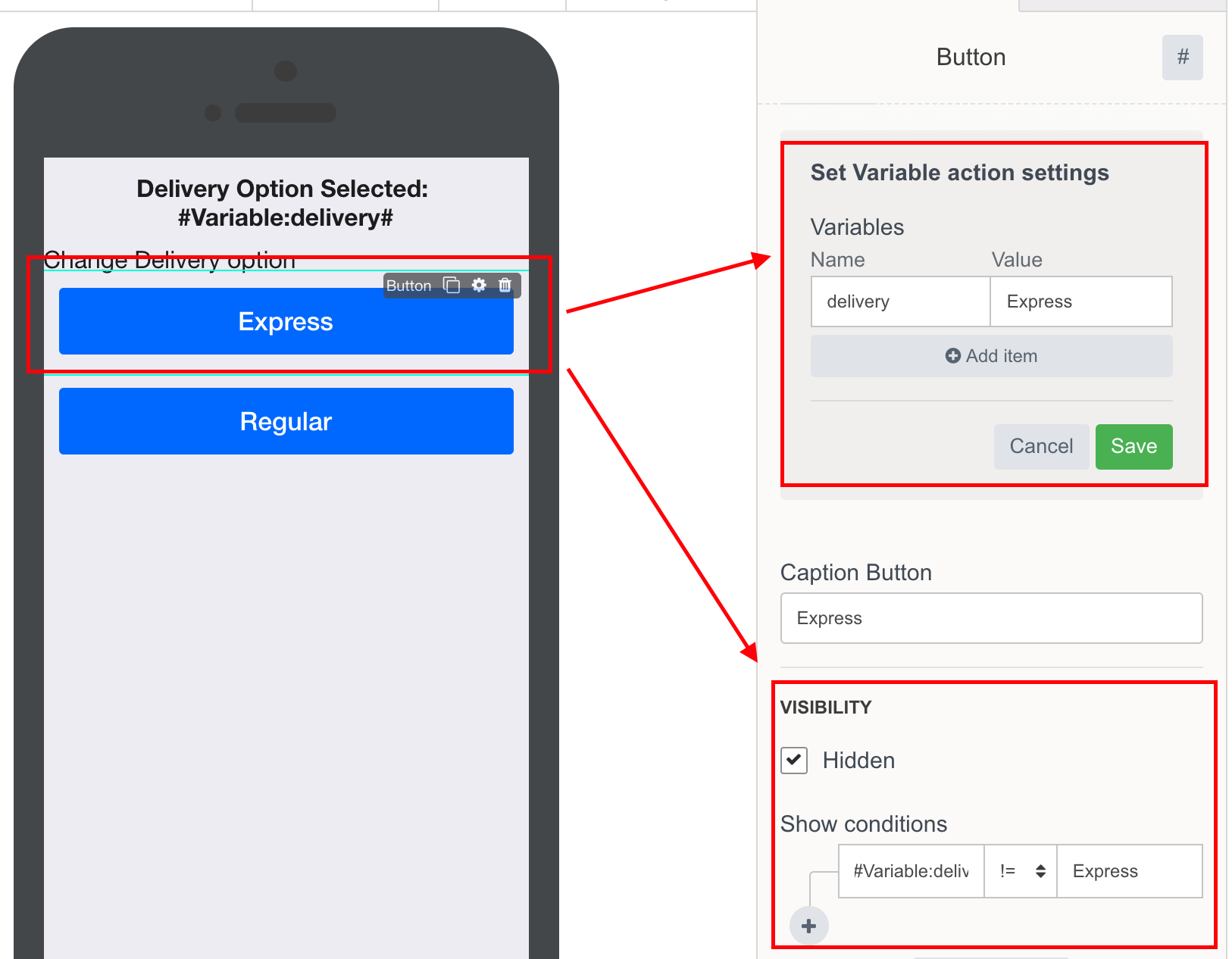 In another example - Pizza delivery app has two options for delivery: Express and Regular. Using Variables, we show / hide the buttons with delivery options.