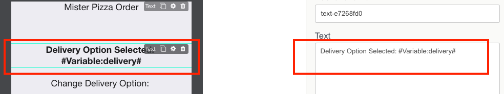Drag and drop Text element, fill in Text field with Delivery Option Selected: #Variable:delivery#.