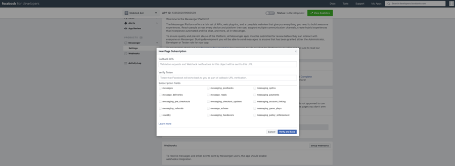 16) In the "Subscription fields" field, select the Webhook events that you want to transfer. To begin with, we recommend that you select at least the parameters for messages and messaging_postbacks;