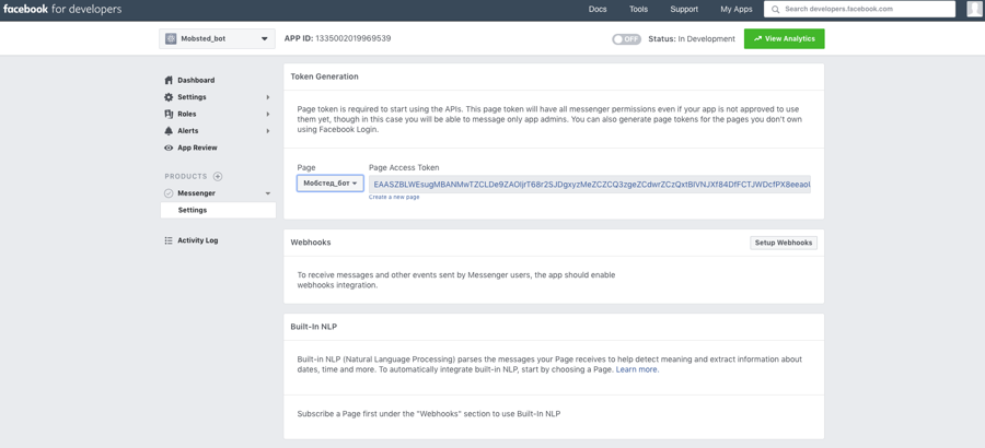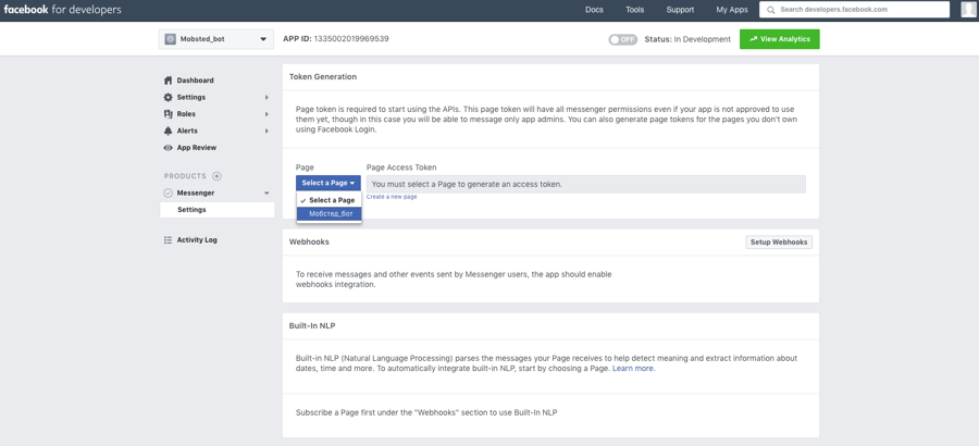21) In the "Webhook" section of the Messenger settings console, click the "Select page" drop-down menu and select the Facebook page for which you created the access token. This will make your application to receive Webhook events from the Page;
