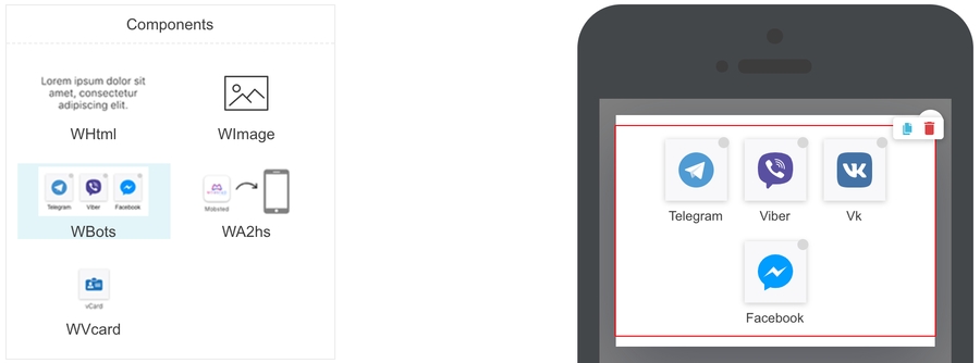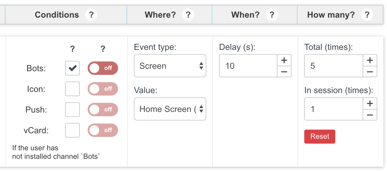 In Conditions section check Bots checkbox ans set off the switcher. This is the instruction for the widget to check if user didn't connect Bots yet. Icon, Push, vCard checkboxes are unchecked, so platform will ignore them