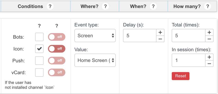 In Conditions section check Icon checkbox and make sure that switcher is set to off. This sets the widget to check if user has already added the app to Home Screen. Bots, Push, vCard checkboxes are unchecked, so Mobsted will ignore them