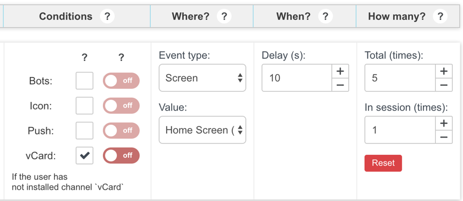 In Conditions section check vCard checkbox and make sure that switcher is set to off. This sets the widget to check if app user has already added the app to the contacts list. Bots, Icon, Push checkboxes are unchecked, so Mobsted will ignore them
