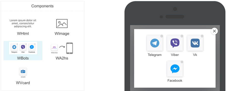 In Conditions section check WBots checkbox and make sure that switcher is set to off. This sets the widget to check if app user has already added the app to the contacts list. Icon, Push, vCard checkboxes are unchecked, so Mobsted will ignore them