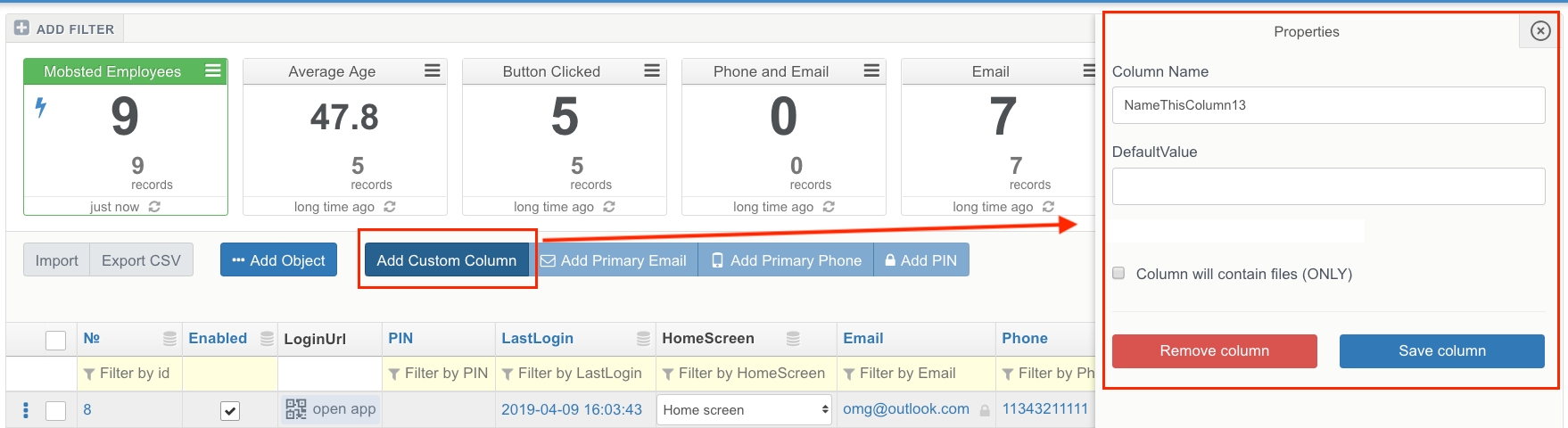 In Objects section of the platform Nickname, Phone and Email columns display the data entered by this app user.