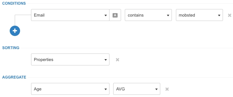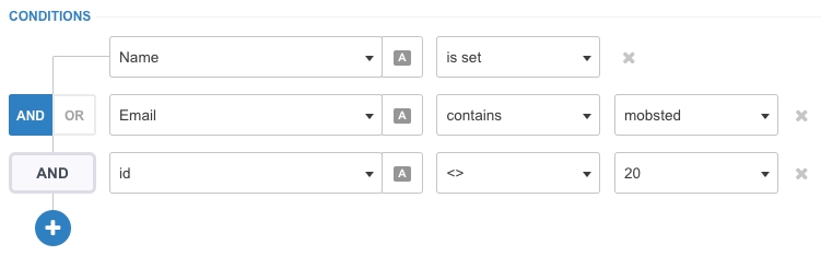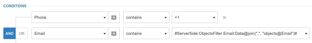 Example: we created the filter that will display everyone with email on Mobsted OR Outlook domain, and who has US phone number.